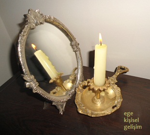 Dolabın çekmecesinden eski pirinç bir ayna çıkardı, arkasında ki ayakları açıp yanan mumun karşısına yerleştirdi. Mumun ışığı yansımayla çoğaldı. İki mum vardı sanki. Adama döndü ve ciddiyetle aynadaki mumu üflemesini söyledi. Adam şaşkın ama iteatkârdı. Üfledi aynada ki mum yansımasına. Işık titreşti çünkü nefesi yanan muma kadar yayılmıştı. Omuzuna dokunarak kalkmasını teşvik eden yaşlı kadının düşünceli yüzünde, gözleri derin ama güçlü bakışlara sahipti.
